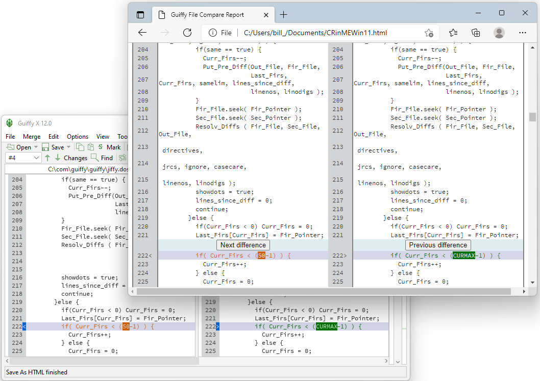 • File Compare reports saved as HTML... reflect all of Guiffy's Style (Color and Font) choices and the diff tool results driven by Ignore and Show options.